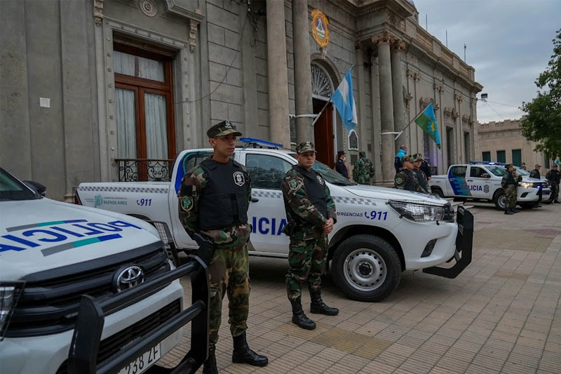 El Subsecretario Calviño Guillermo dentro del Plan de Fortalecimiento de la seguridad del Ministerio de Seguridad de la Provincia de Bs As, entregó en la ciudad de Las Flores, siete móviles destinados al Comando de Prevención Rural (CPR), y la incorporación de 19 nuevos efectivos policiales junto al Intendente Alberto Gelené y autoridades de las Fuerzas de Seguridad.
