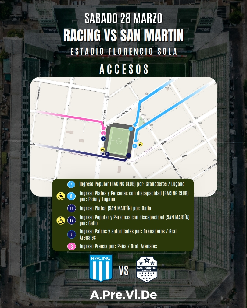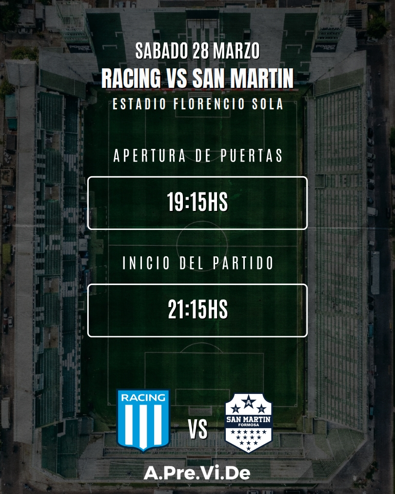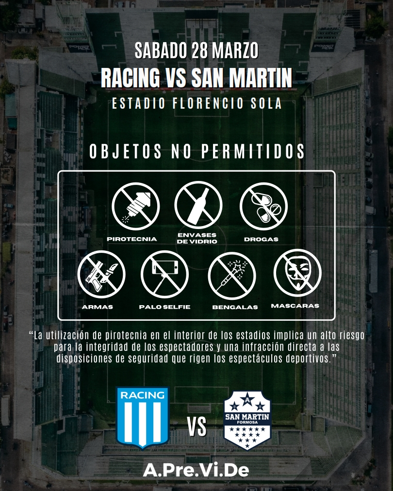 El Ministerio de Seguridad de la provincia de Buenos Aires a través de la Agencia de Prevención de la Violencia en el Deporte -APreViDe- informa que el encuentro entre Racing Club y el Club Sp. Gral. San Martín el próximo sábado 28 de marzo a las 21.15 horas en el Estadio “Florencio Sola” por Copa Argentina, contará con la participación de alrededor de 300 efectivos, 85 agentes de seguridad privada, servicio médico de emergencias, y 60 empleados de Utedyc.