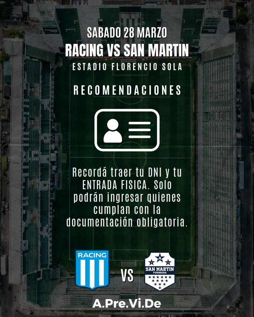 APREVIDE: OPERATIVO DE SEGURIDAD RACING - SAN MARTÍN (FORMOSA) EN EL ESTADIO DE BANFIELD.