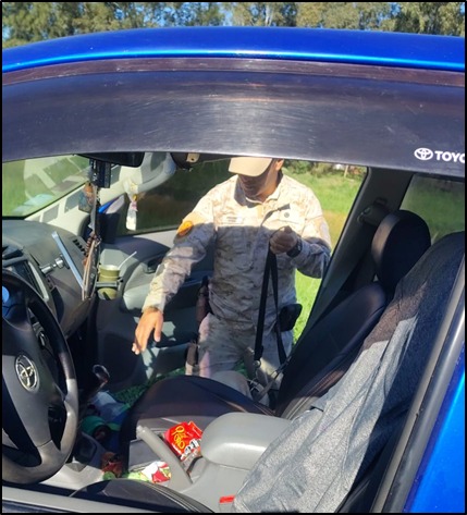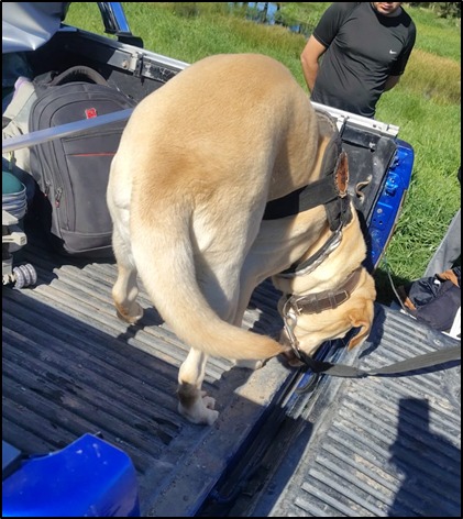 Durante la jornada se efectuaron tareas de interceptación vehicular, con registros a cargo de canes entrenados en la búsqueda de estupefacientes. Los binomios conformados por el Oficial Subinspector Jonatan Castro y el Subteniente Jesús Dávalos desplegaron a los ejemplares “Rock” (Labrador macho) y “Furia” (Ovejero Alemán hembra), especializados en detección de drogas.